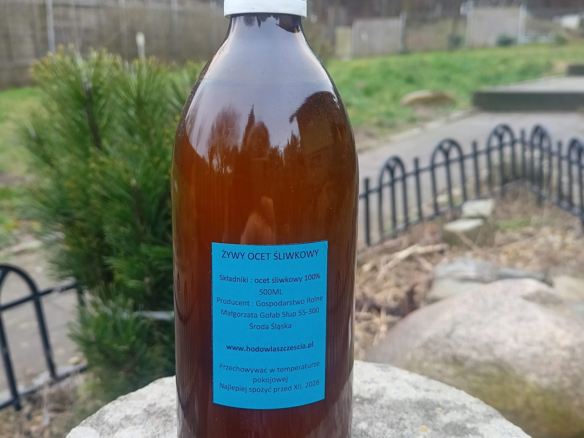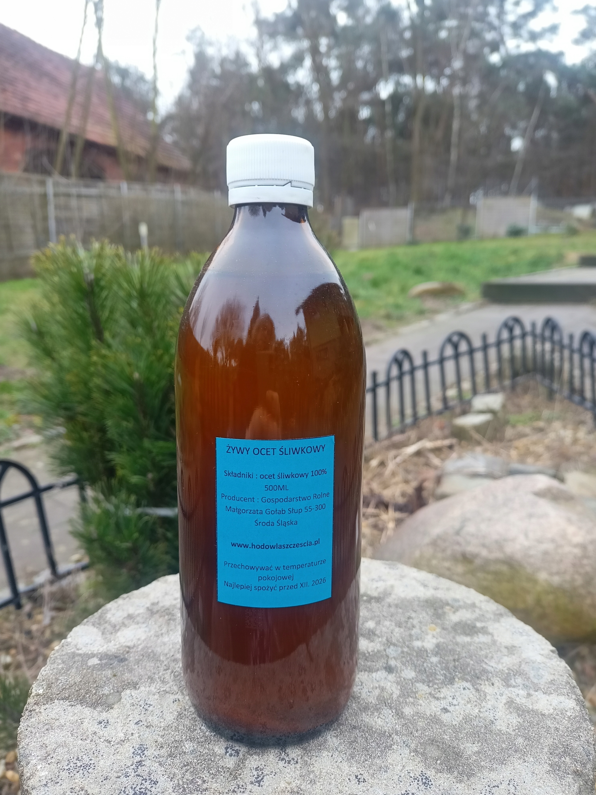 Ocet śliwkowy powstał z dojrzałych śliwek węgierek uprawianych w naszym Gospodarstwie Rolnym.